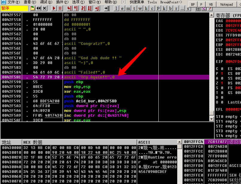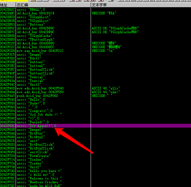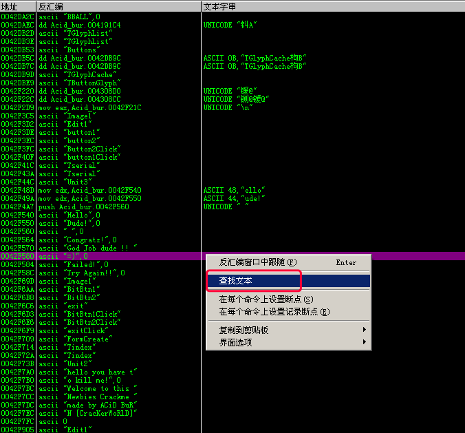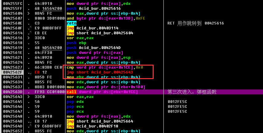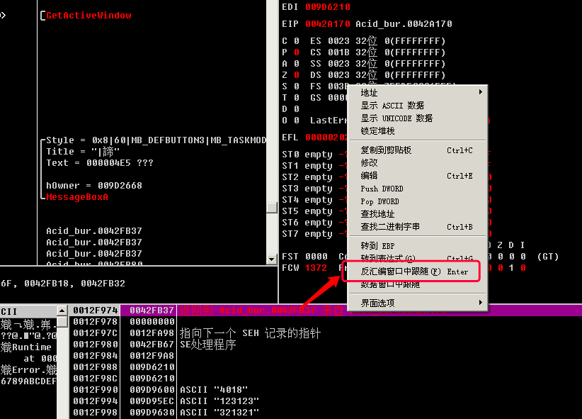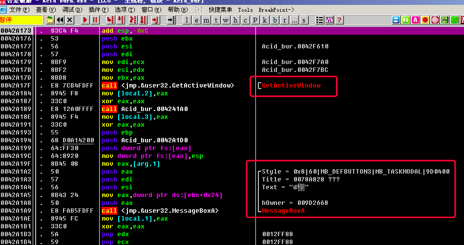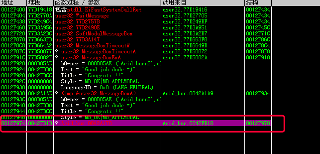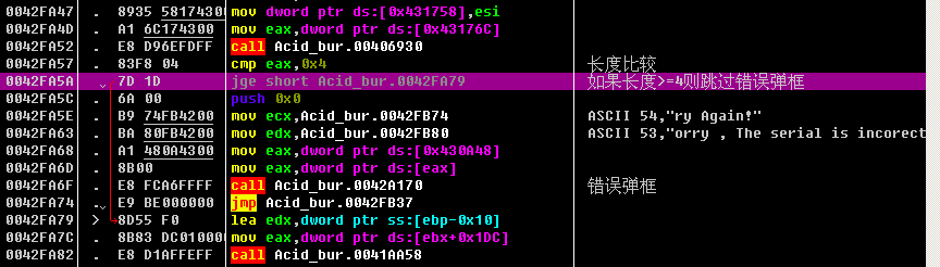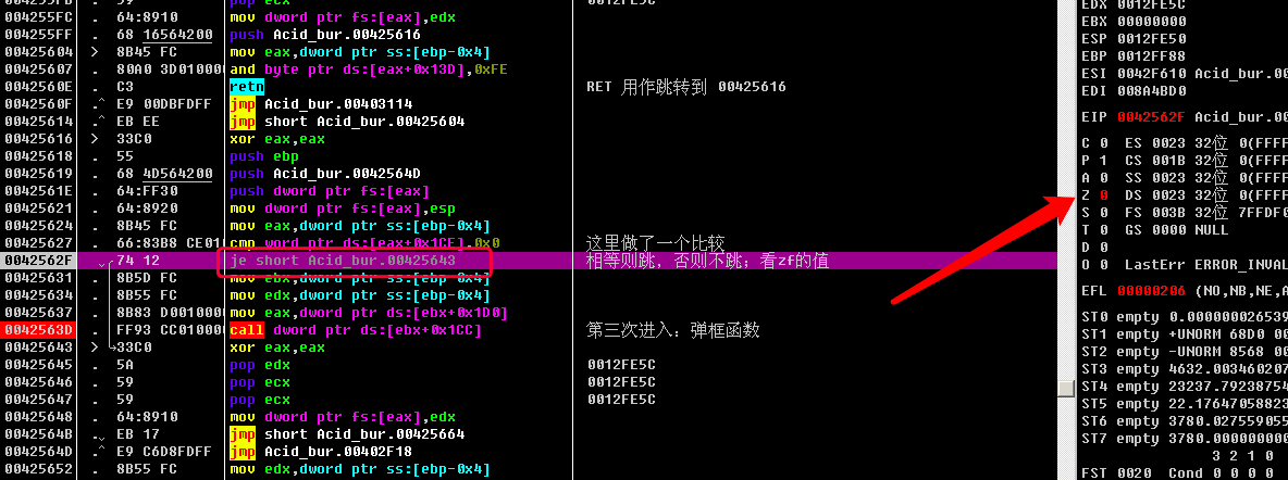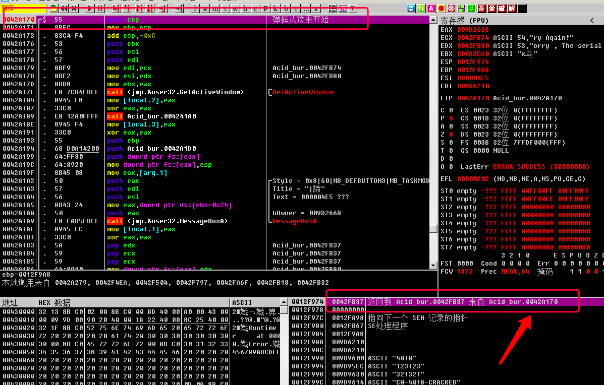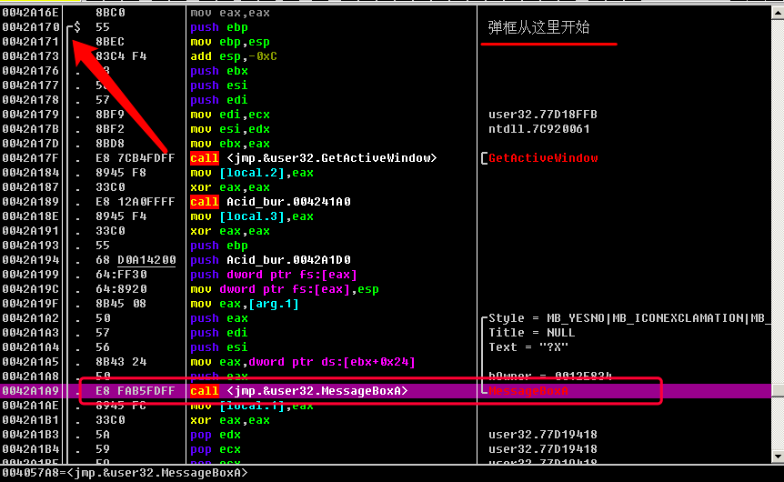 成功弹框执行完成之后, 会有一个jmp short Acid_bur.0042F509, 跳过失败弹框的逻辑, 因为前面已经执行完成功弹框的逻辑了, 当然要跳过失败弹框的逻辑啦!