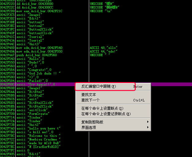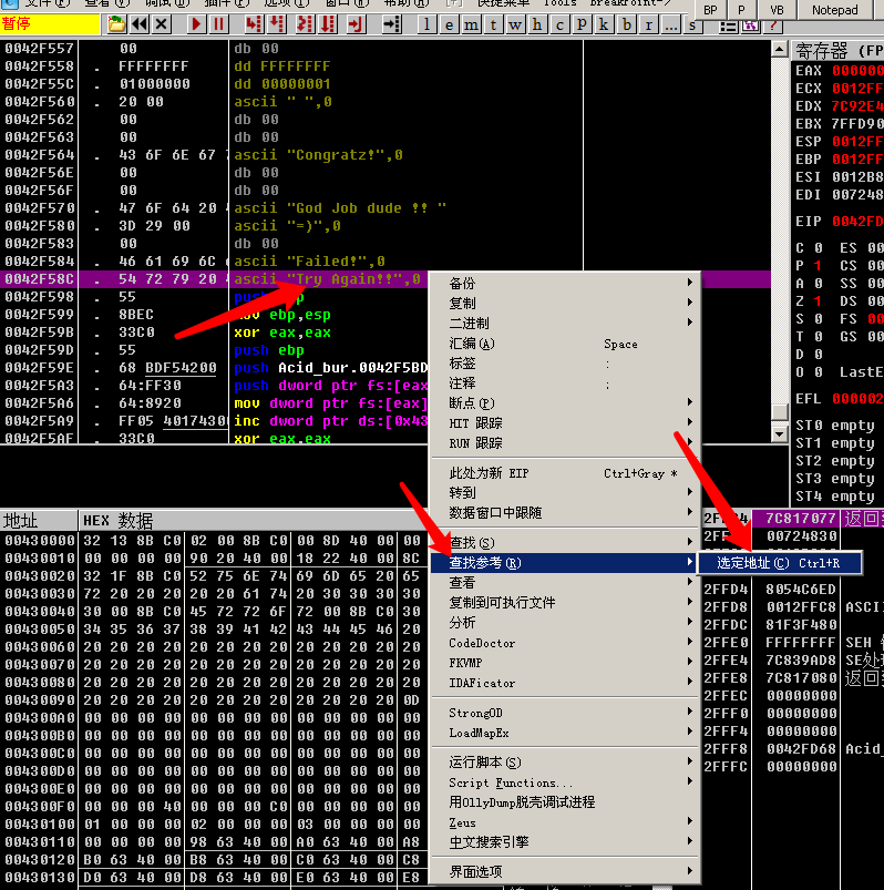 我们先看看Try Again!!在哪先, 选中该语句右键查找参考->选定地址(快捷键Ctrl+R)