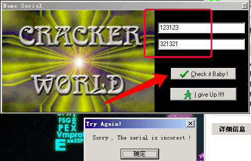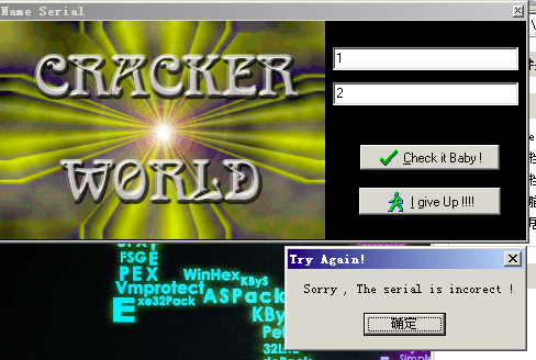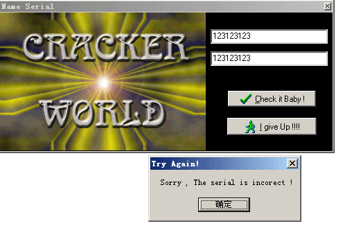 首先看下左边那个按钮,点击进去看下情况,发现有两个输入框,分别是输入用户名和序列号,然后点击Check it Baby,程序会进行校验,校验失败会弹出下面窗口,提醒你Try Again!!