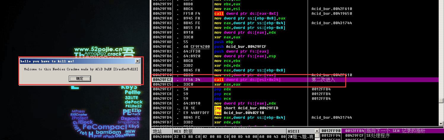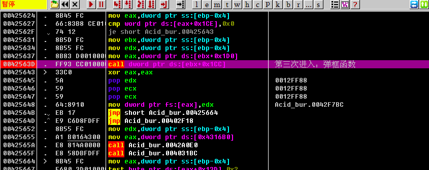 老方法, 按F2下断点、Ctrl+F2重新加载程序,按F9运行到第一个断点call Acid_bur.00429F8C处, F7进入函数, 按F9运行到第二个断点call dword ptr ds:[esi+0x24], 按F7进入该函数, 继续F8单步调试,在call dword ptr ds:[ebx+0x1CC]位置NAG窗口继续弹出