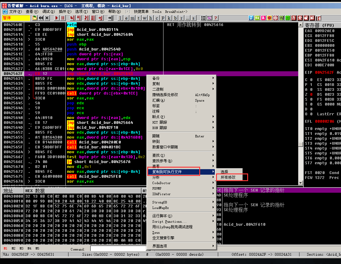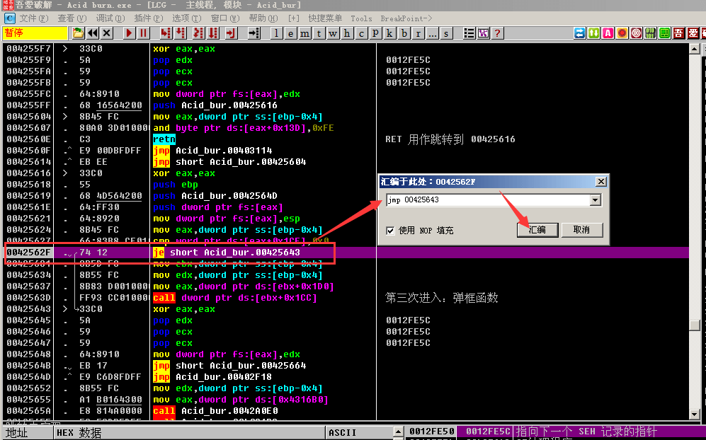 双击je short Acid_bur.00425643, 将弹框内的je short 00425643改成jmp 00425643, 点击汇编