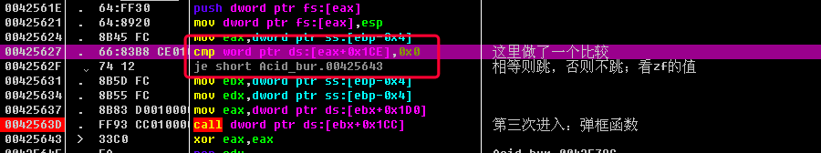 这里我们不妨在这个jnz前面的函数call Acid_bur.004039FC上按F2插入一个断点, 看看发生了这个函数发生了啥