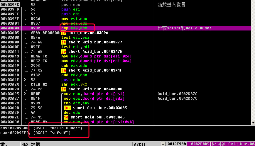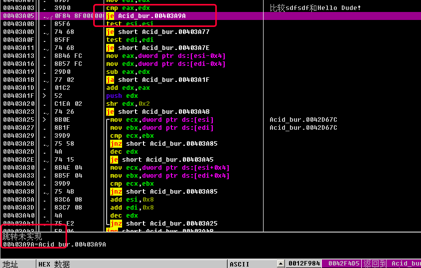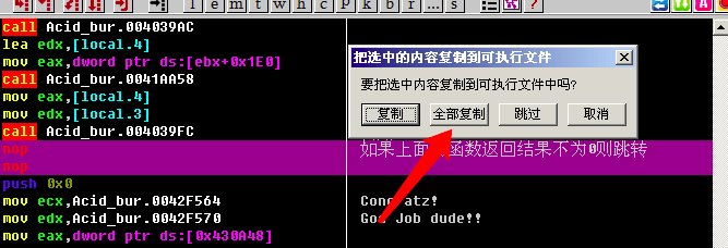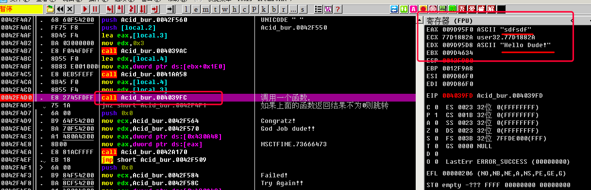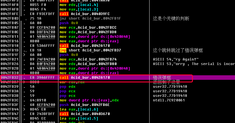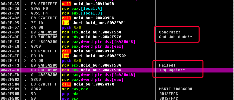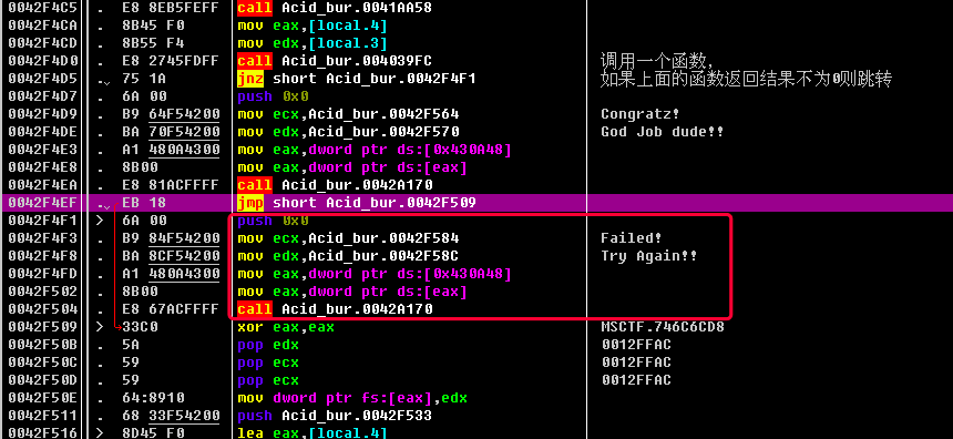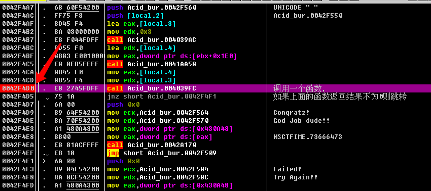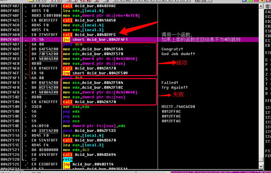 简单讲一下这里的逻辑: 先调用一个函数call Acid_bur.004039FC, 如果返回结果不为0, 则jnz short Acid_bur.0042F4F1, 即跳转到下面的失败弹框; 如果返回结果为0, 则不跳转, 执行成功的弹框.