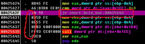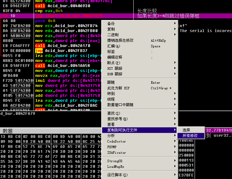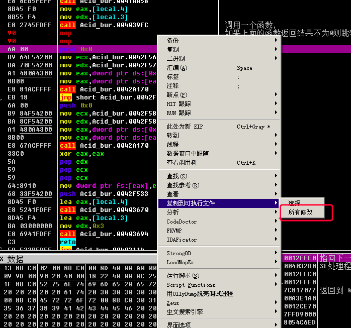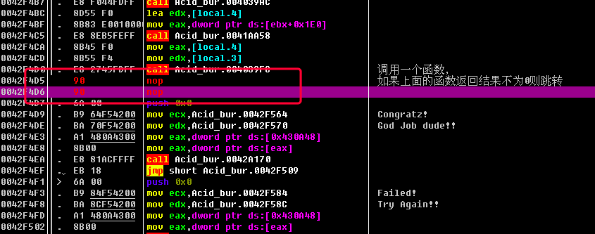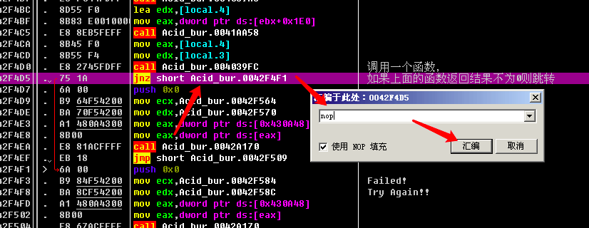 方法一的思路是, 不管前面的函数返回啥, 我将jnz short Acid_bur.0042F4F1, 改成nop, 直接不跳转, 让程序继续往下执行.