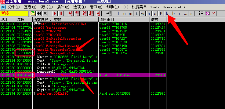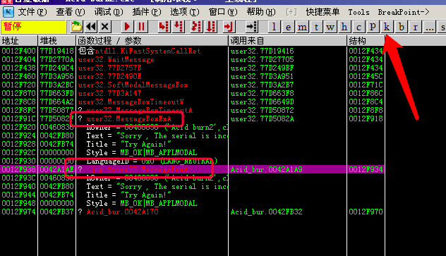 此时我们重新打开未修改过的Acid burn2.exe, 再让它弹出错误窗口, 切换OD, 再按F12暂停一下, 按堆栈k小图标(Ctrl+K)窗口, 看一下最后一个调用, 是不是发现什么特殊的地方?
