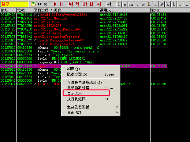 对啦!那个CALL就是调用MessageBox的地方,所以,下次我们就不用在MessageBox处下断跟踪了,直接最后一个地址->右键->显示调用