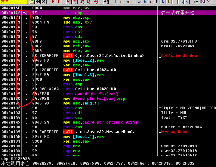 注意观察弹框开始的 push ebp左边, 那里有一根线, 可以帮助我们定界