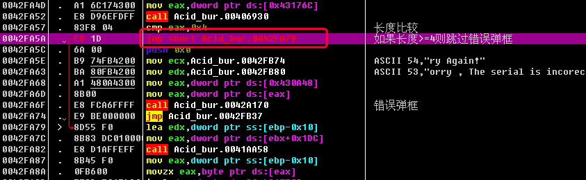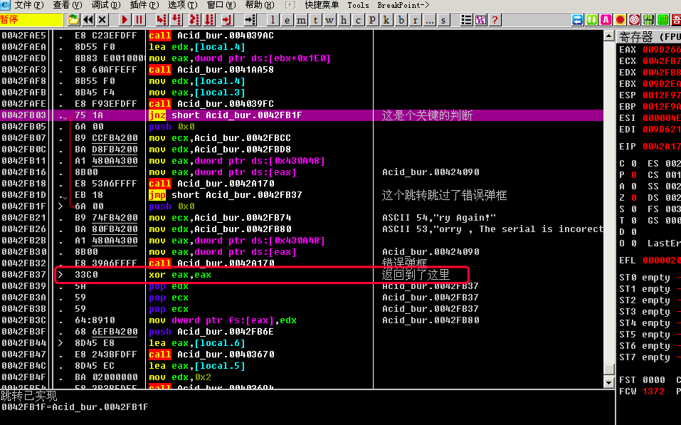 0042FB03 |. 75 1A jnz short Acid_bur.0042FB1F ; 这是个关键的判断