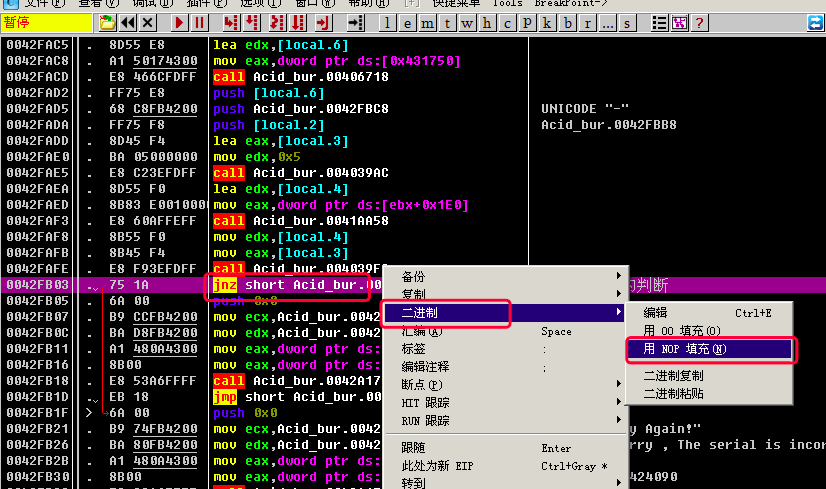双击jnz short Acid_bur.0042F4F1, 改成nop
