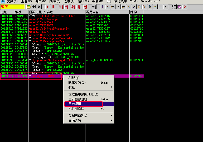我们保持当前错误窗口别关掉, 回到OD, 按F12暂停->点堆栈k小图标->最后一个地址->显示调用