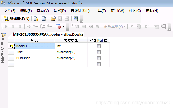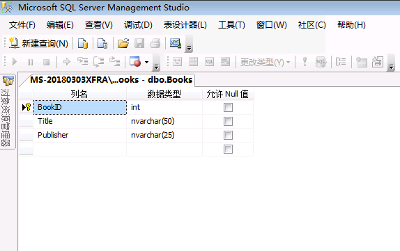 在第一个例子中,首先创建数据库,在此 使用 SQL SERVER 2008 R2,示例数据库只有一个表 Books。