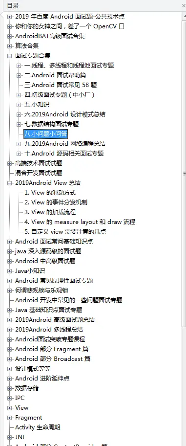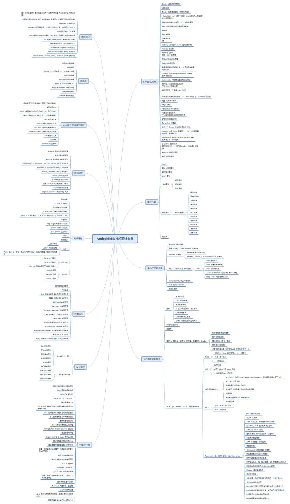 本部分内容是关于Android进阶的一些知识总结,涉及到的知识点比较杂,不过都 是面试中几乎常问的知识点,也是加分的点。 关于这部分内容,可能需要有一些具体的项目实践。在面试的过程中,结合具体自 身实践经历,才能更加深入透彻的描绘出来
