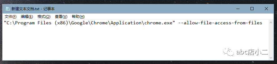 3).在桌面新建一个txt文本,将其值复制到文本中,并在结尾空一格再输入--allow-file-access-from-files