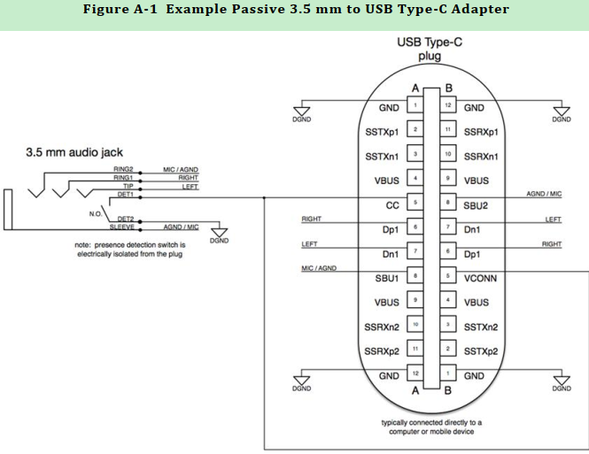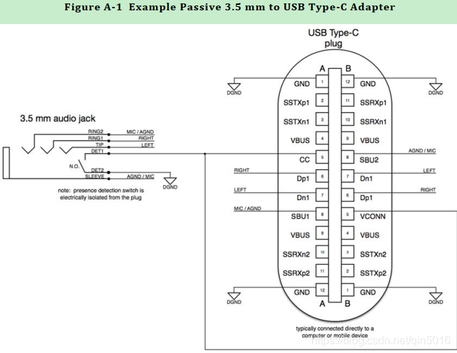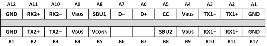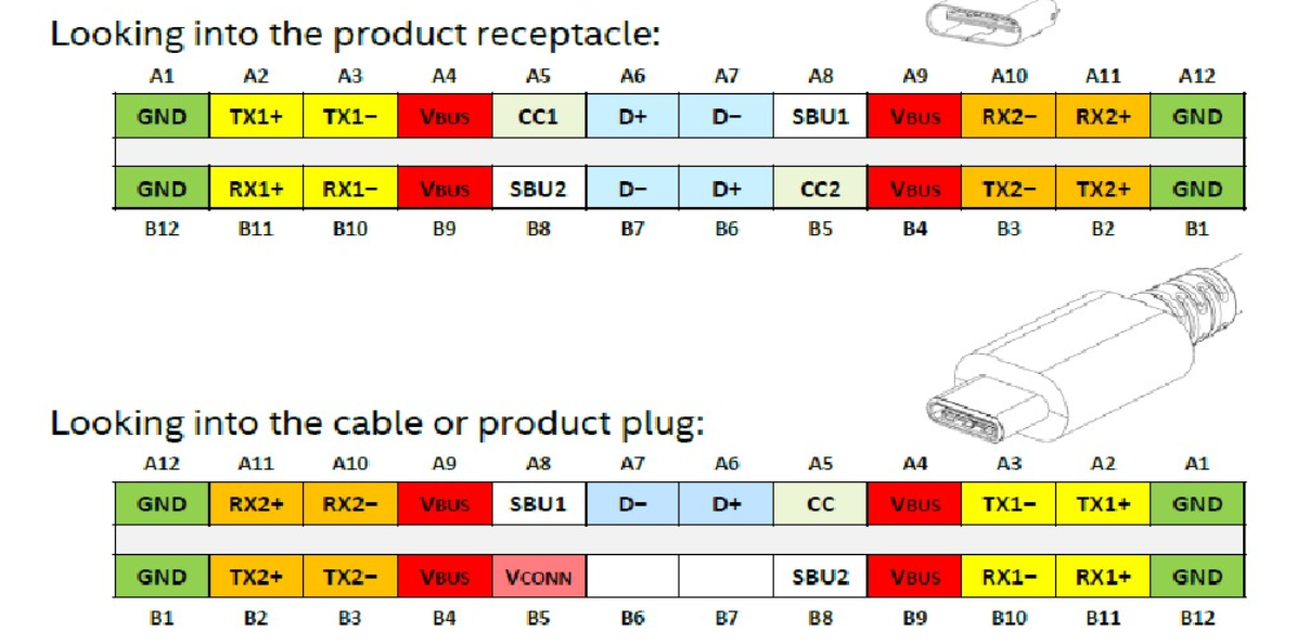 2 USB 2.0数据线,D+/D-。它们在插头端只有一对,和旧的USB 2.0规范一致。但为了支持正反随意插。在插座端定义了两组。