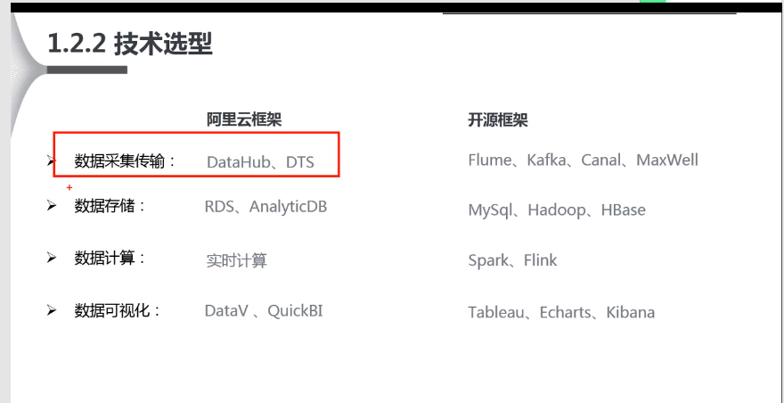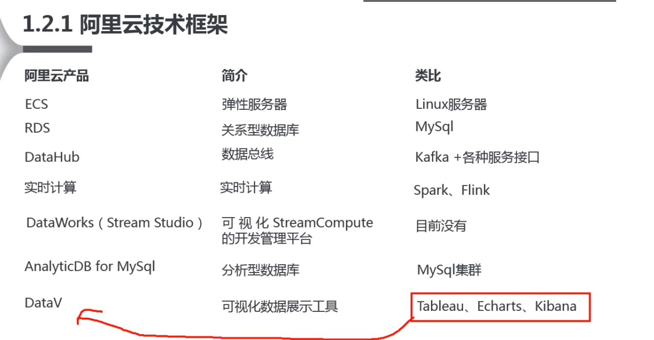 上面就是阿里云的技术框架与一些D传统的大数据解决方法技术对比。通过对比可以看出,虽然使用的工具有差异,但是大致的框架结构的作用都是大同小异的。