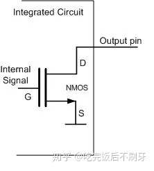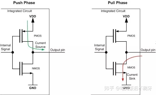 Pull - 当连接到晶体管栅极的内部信号被设置为高逻辑电平(逻辑1)时,NMOS晶体管被激活(闭合)并且电流开始从输出引脚流到GND。同时,PMOS晶体管无效(开路)且不导通电流。看起来推挽输出十分完美,对高低电平都有相当不错的输出能力。但推挽输出的一个缺点是,如果当两个推挽输出结构相连在一起,一个输出高电平,即上面的MOS导通,下面的MOS闭合时;同时另一个输出低电平,即上面的MOS闭合,下面的MOS导通时。电流会从第一个引脚的VCC通过上端MOS再经过第二个引脚的下端MOS直接流向GND。整个通路上电阻很小,会发生短路,进而可能造成端口的损害。这也是为什么推挽输出不能实现" 线与"的原因。