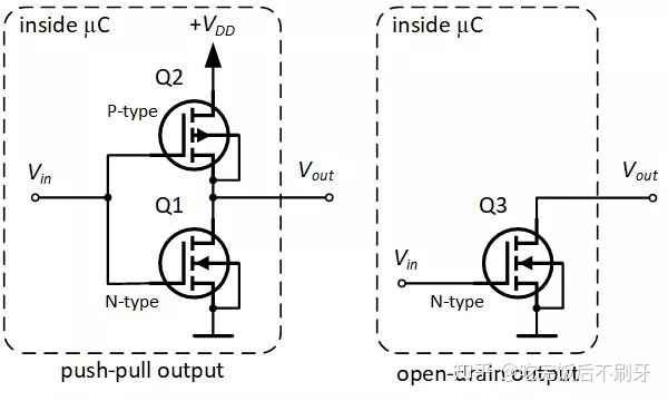 ● 推挽输出:一般是指两个MOSFET分别受两互补信号的控制,总是在一个MOS管导通时另一个MOS管截止。(推挽输出的最大特点是可以真正的输出高电平和低电平,且两种电平下都有驱动能力)。