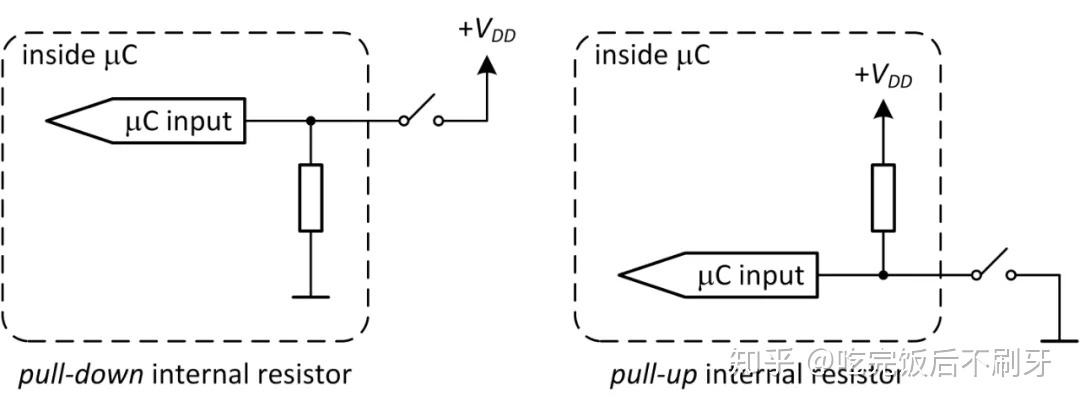 如果我们需要这个port有一个明确的预设状态时,必须借助pull-up(pull-down)resistor来做调整,在pull-up resistor(pull-up外接高电压,pull-down通常会接地)的作用之下,让port的维持在明确的高电压状态(pull-down则是让port维持在低电压状态)。