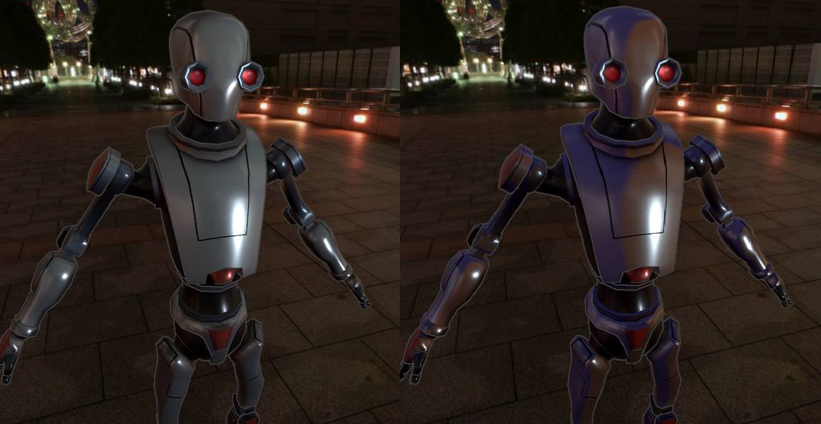 以下图为例,左边是Unity Standard Shader 的效果,右边是 Ramp Shading 和 明暗偏色 后的效果,注意高光部分的表现,差别不大: