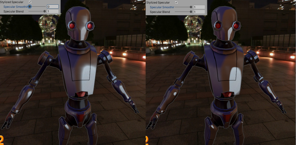 StylizedSpecular 函数的 specSmoothness 参数控制高光拖尾的长度,这个值越大,高光拖尾越短,线条感越强,如下图:
