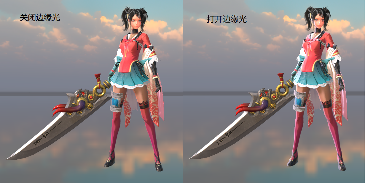 最后上图,下图是 小甜甜 开关 边缘光 的效果对比:
