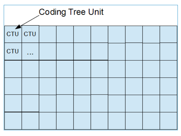 HEVC中引入了树形编码单元(Coding Tree Unit),即一帧图像可以划分为若干个互不重叠的CTU,如下图所示。