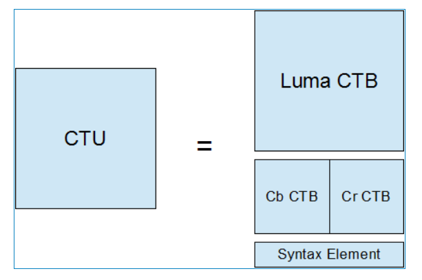 每个CTU由同一位置处的一个亮度CTB和两个色度CTB再加上相应的语法元素组成,尺寸由编码器指定,且可大于宏块尺寸,如下图所示。