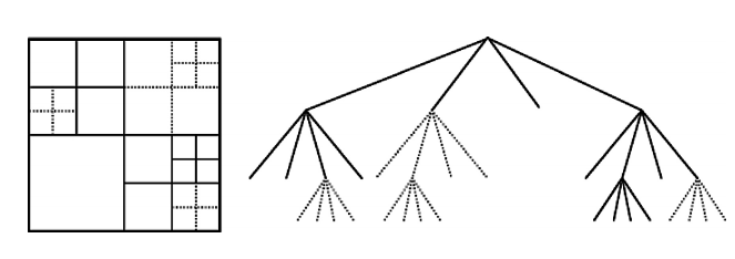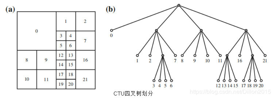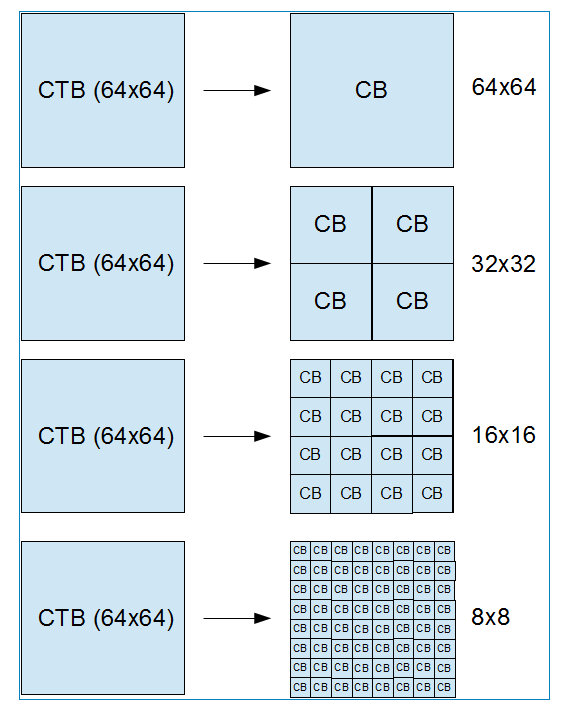 在高分辨率视频编码中,使用较大的CTB可以获得更好的压缩性能。一个CTB可以直接作为一个编码块CB,也可以进一步通过四叉树形式划分为多个小的CB,如下图所示。