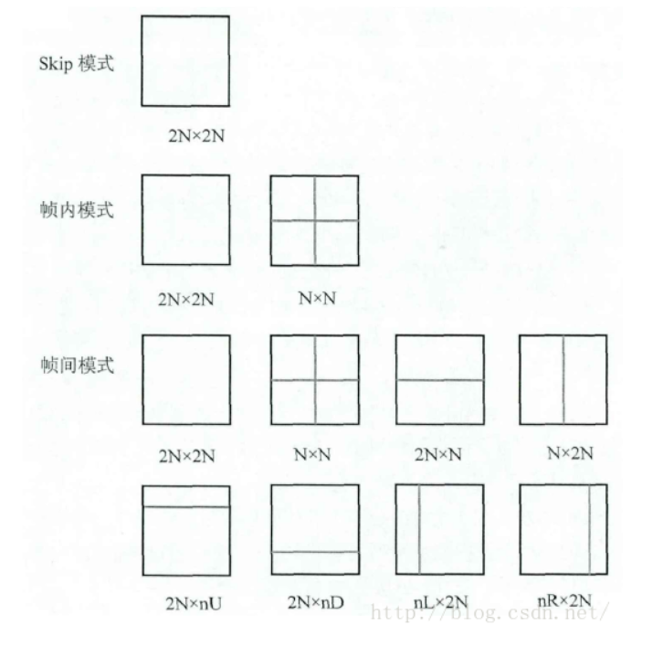 CB对于预测类型决策来说已经足够好了,但它仍然可能太大,无法存储运动矢量(帧间预测)或帧内预测模式。因此,进行预测时,可以将CB进一步划分为PB,划分方式由预测方式决定。如下图所示,Skip是帧间预测的一种。