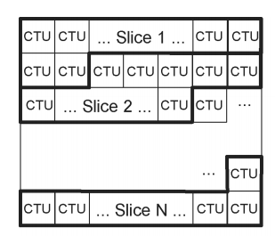 如下图,一幅图像被划分为N个Slice,Slice成条带形。在编码时,每一个Slice中的CTU按光栅扫描顺序进行编码。