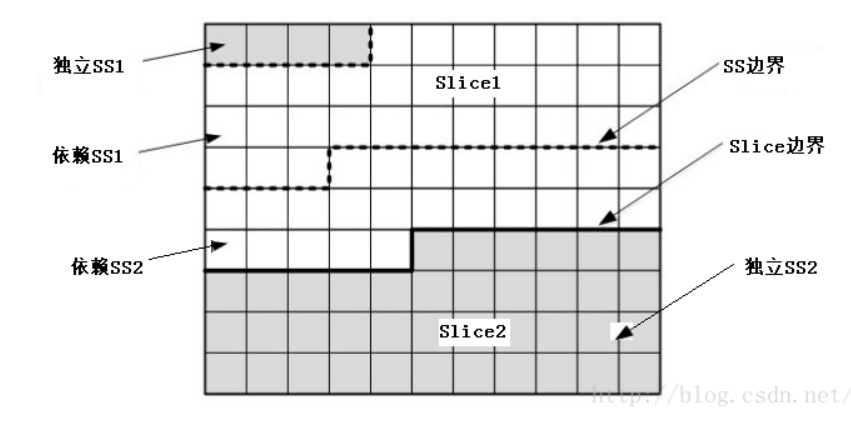 如图Slice以独立SS作为开始,一个SS包含整数个CTU(至少一个)。预测过程不可以跨越Slice边界,但是可以跨越依赖SS边界,一个Slice中的SS之间可以相互参考。