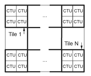在HEVC中一幅图像可以划分为若干个Tile(这是相比AVC的优化改进),即从从水平和垂直方向将图像分割为若干个矩形区域,把这些矩形区域称为Tile。通常每个Tile包含的CTU数据近似相等。