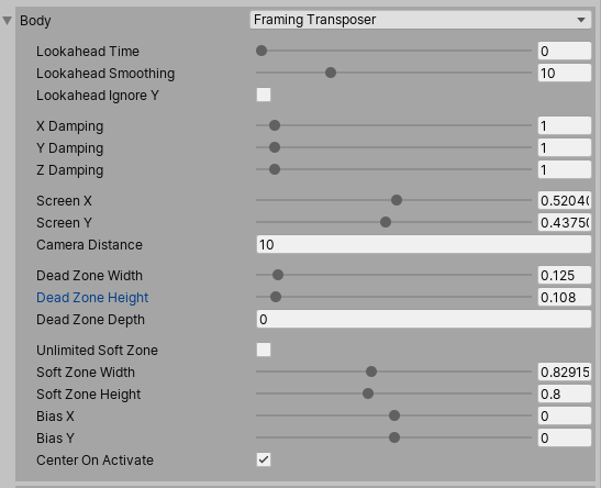 - Framing Transposer:跟随目标移动,并在屏幕空间保持相机和跟随目标的相对位置。