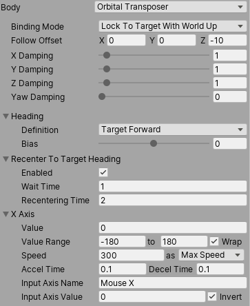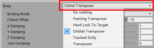 - Orbital Transposer:相机和跟随目标的相对位置是可变的,还能接收用户的输入。常见于玩家控制的相机。