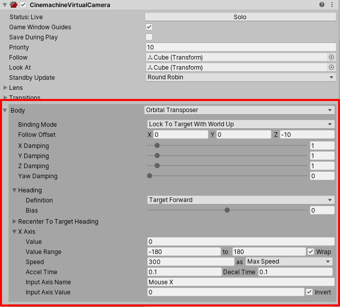 如果给Orbital Transposer添加了输入控制器,玩家就可以控制相机围绕目标旋转。可以设置为Input Manager中的轴,也可以直接用脚本控制。