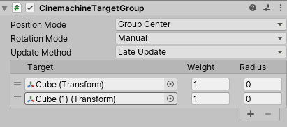 1、菜单栏选择Cinemachine > Create Target Group Camera。Unity会在场景中添加一个虚拟相机和Target Group。Follow和Look At属性会自动设置为这个Group。