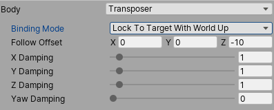 - Transposer:跟随目标移动,并在世界空间保持相机和跟随目标的相对位置固定。