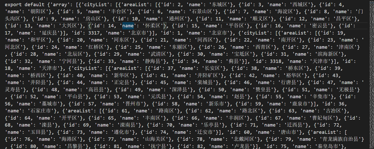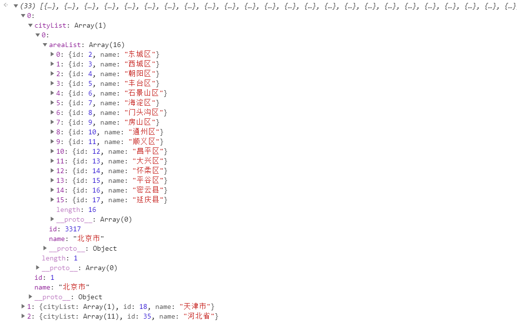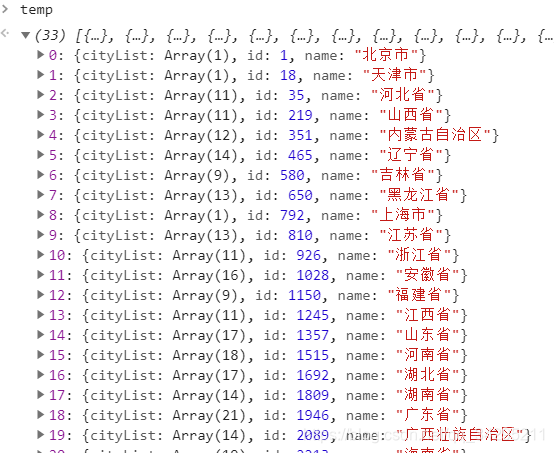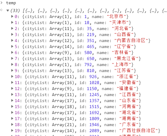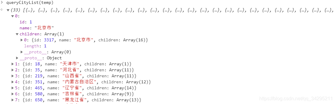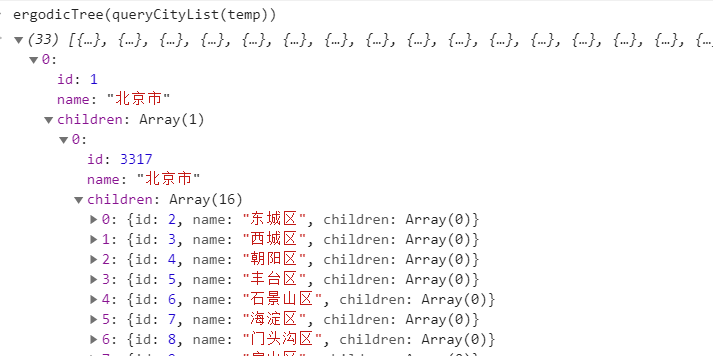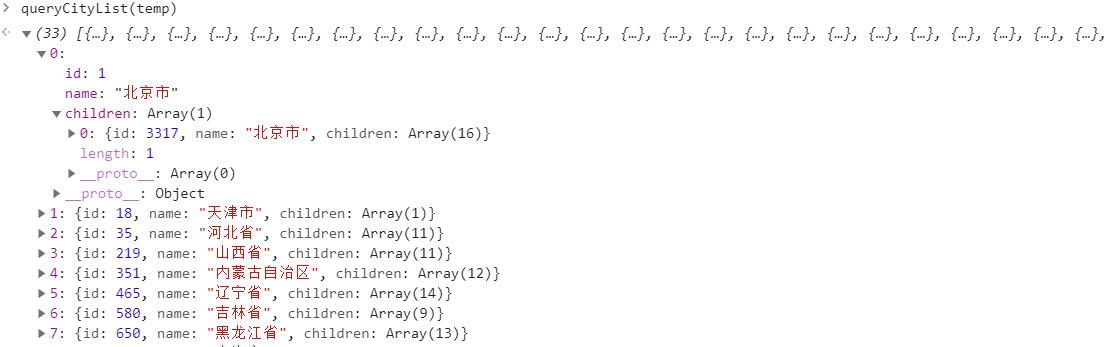 我们看到queryCityList这个方法已经把我们非标准的树状结构数据变成了标准的树状结构数据并进行了输出。