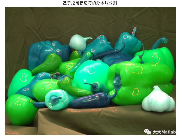 其中,f 是灰度图像,mask 是二值图像,mask 的前景像素标记了输出图像 mp 中局部最小区域的期望位置。通过在内部和外部标记符的位置覆盖局部最小区域,可以改进梯度图像,用于控制过分割的一种方法是基于标记符的概念。标记符是属于一幅图像的连通分量。我们希望有一个内部标记符集合,它们处在每个感兴趣物体的内部,而外部标记符集合包含在背景中。标记符的选择范围可以从简单过程到更复杂的方法,涉及尺寸、形状、位置、相对距离、纹理内容等等。指针是携带对分割有影响的先验知识的标记符。人们常常使用先验知识在每天的视觉中帮助解决分割和高级任务。最为熟悉的便是使用文本。因此,分水岭分割提供可以有效利用这些类型的知识的框架这一事实,是这一方法的突出优点。