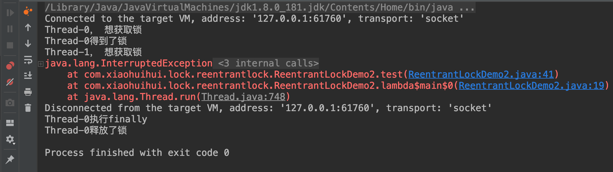 响应中断后,Thread-1后面的代码没有执行,如果使用lock.lock()或者使用同步关键之synchronized就不能够得到这种结果。