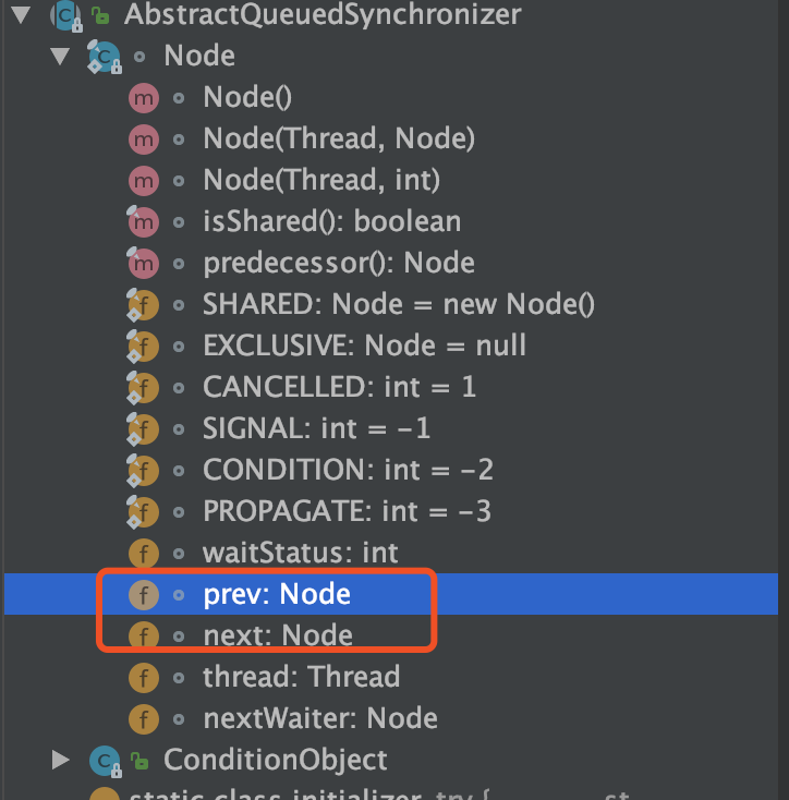 AbstractQueuedSynchronizer中使用Node节点来存储等待线程集合,从源码中可以看到是一个双向链表的数据结构。