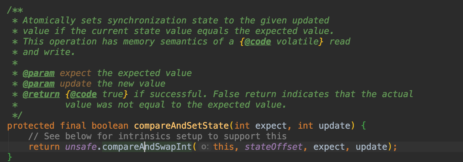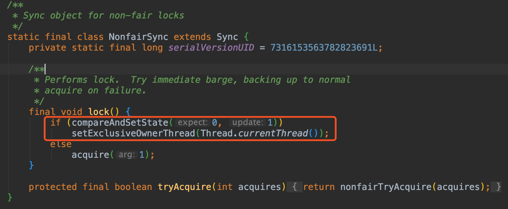 当我们调用lock.lock()时,会调用同步器中的compareAndSetState(int expect, int update)方法,使用unsafe操作state状态,如果操作成功,设置线程拥有者。