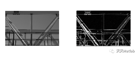 =imread('gantrycrane.png');I=rgb2gray(I);h1=[-1, -1. -1; 2, 2, 2; -1, -1, -1];h2=[-1, -1, 2; -1, 2, -1; 2, -1, -1];h3=[-1, 2, -1; -1, 2, -1; -1, 2, -1];h4=[2, -1, -1; -1, 2, -1; -1, -1, 2];J1=imfilter(I, h1);J2=imfilter(I, h2);J3=imfilter(I, h3);J4=imfilter(I, h4);J=J1+J2+J3+J4;h=figure;set(h,'color','white')subplot(121); imshow(I);subplot(122); imshow(J);
