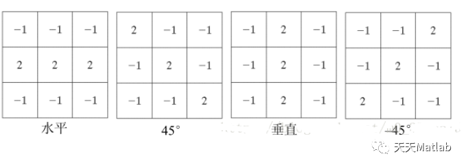 如果图中的第一个模板在图像上移动,就会对水平线(一个像素宽)的响应更强烈。对于恒定的背景,当线通过模板的中间一行时可能产生更大的响应。同样,图 中的第 2 个模板对+45°线响应最好,第 3 个模板对垂直线响应最好,第 4 个模板对 –45°线响应最好。注意,每个模板的优先方向都用比其他可能方向要大的系数加权。每个模板的系数之和为 0,这表明在恒定亮度区域中,模板的响应为 0。若每方向模板都应用于同一图像,其中一方向模板在图像中心点响应比其他模板在图像中心点响应都大,我们就说那个点与模板 i 方向的线更相关。