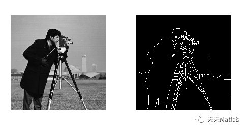 I=imread('cameraman.tif');I=im2double(I);[J, thresh]=edge(I, 'prewitt', [], 'both');h=figure;set(h,'color','w')subplot(121); imshow(I);subplot(122); imshow(J);