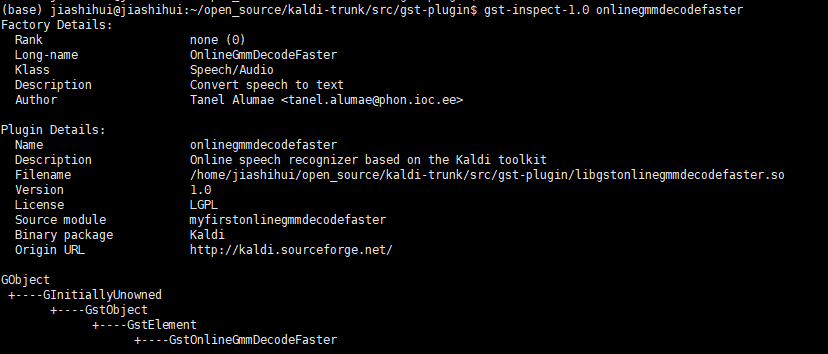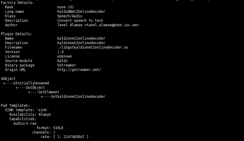 输入:GST_PLUGIN_PATH=. gst-inspect-1.0 kaldinnet2onlinedecoder,看到下图即可: