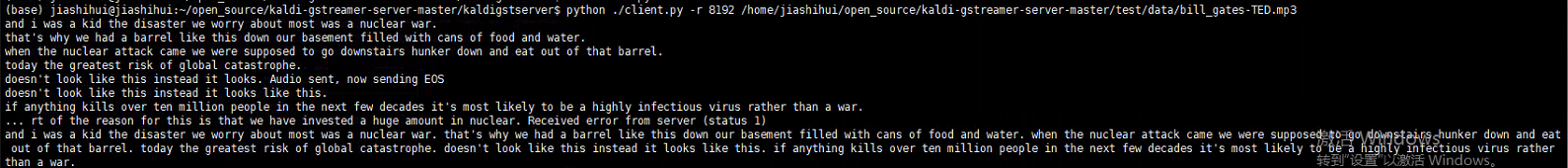python ./client.py -r 8192 /home/jiashihui/open_source/kaldi-gstreamer-server-master/test/data/bill_gates-TED.mp3