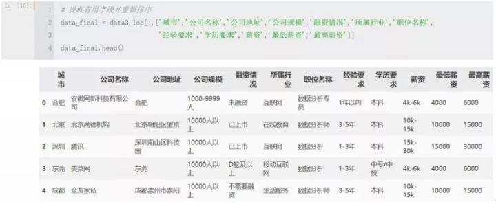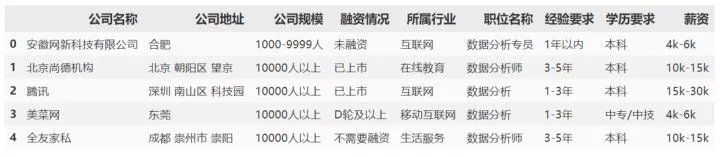 明确分析目的后,接下来要做的就是为了解决这些问题,有针对性的获取相关数据。之所以说“有针对性”,是因为并不是数据越多越好,数据越多,我们的抓取、清洗成本也就越高,只有对本次分析有用的数据才是有价值的数据。因此,根据我们的分析目的,本文用Python从BOSS直聘中抓取了如下字段信息:公司名称,公司地址,公司规模,融资情况,所属行业,职位名称,经验要求,学历要求,薪资。源数据格式如下: