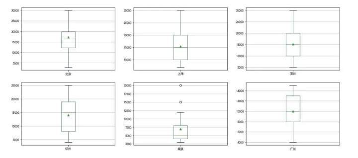 对于北京,数据分析师的平均起薪分布对称,比较符合正态分布;上海、深圳、南京呈右偏分布,其中上海、深圳高薪资职位相对较多,南京有个别公司起薪异常高。杭州、广州呈左偏分布,半数职位起薪在10000以下,个别职位薪资不超过5000,远远低于平均水平。