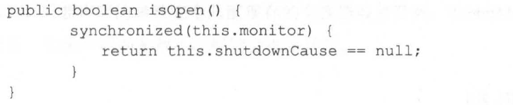 Channel或者Connection中有个isOpen方法可以用来检测其是否已处于开启状态。但并不推荐在生产环境的代码上使用 isOpen方法,这个方法的返回值依赖于shutdownCause (参考下面的代码)的存在,有可能会产生竞争,代码清单是isOpen方法的源码: